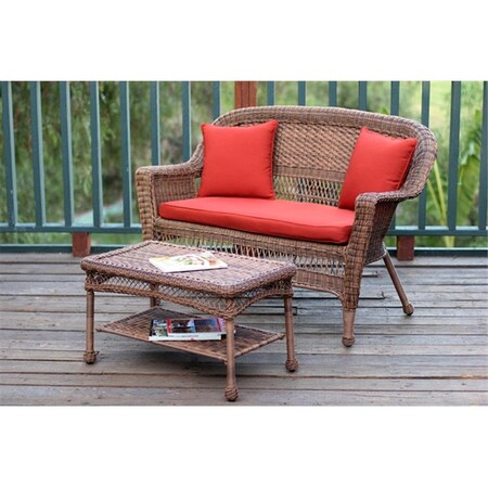Honey Wicker Patio Love Seat And Coffee Table Set With Red Orange Cushion