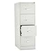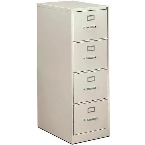 Commercial-grade files to meet your long-lasting needs. Spring-loaded follower block in each drawer keeps files upright and neat. High drawer sides add strength and serve as front-to-back hangrails. Thumb latch keeps drawers safely closed. Label holders for quick and easy identification of contents. HON "One Key" core removable locks. Steel ball bearing suspension. Color: Light Gray; Overall Width: 18 1/4"; Overall Depth: 26 1/2"; Overall Height: 52".