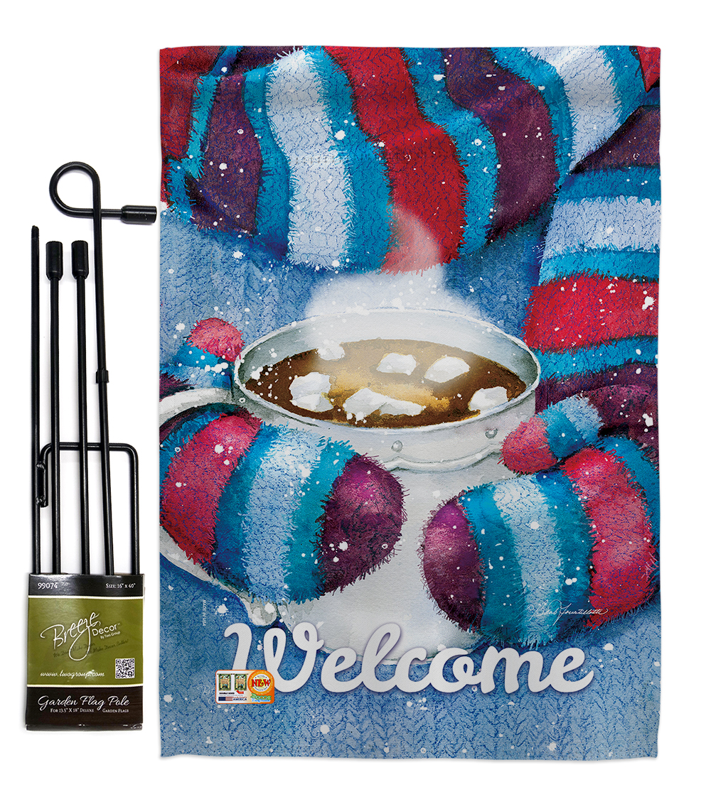 Breeze Decor GS114217-BO Mittens and Cocoa Winter Wonderland Decorative Vertical Garden Flag with Banner Pole, Set 13"x 18.5", Multi-Color