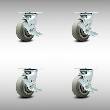 Stainless Steel Thermoplastic Rubber Flat Tread Swivel Caster w/Main. Free Bearings Set of 4 w/5" x 2" Gray Wheels - Includes 4 Swivel w/Top Lock Brakes - 1400lbs Total Capacity - Service Caster Brand