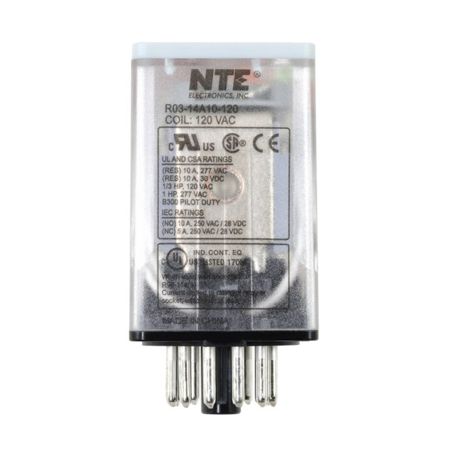 NTE Electronics R03-14A10-120 Series R3 General Purpose Full-Feature AC Relay, 3PDT Contact Arrangement, 10 Amp, 11 Pin Octal Plug, 120 VAC