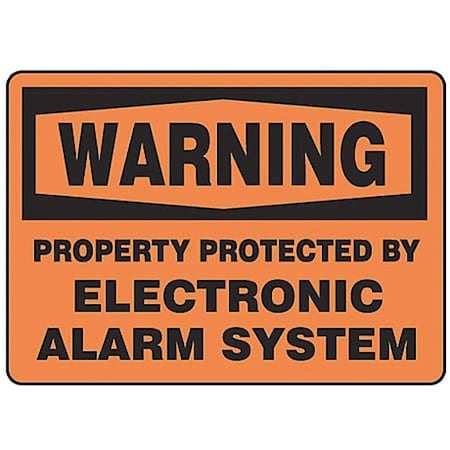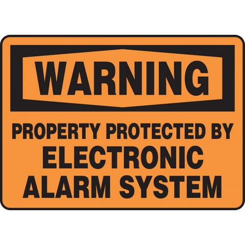 Accuform MASE303VS, 10" x 14" Adhesive Vinyl OSHA Sign: "Property Protected By Electronic Alarm System" Prevent unauthorized access to your site by warning of security protocols. Warn trespassers of property protection system Black and orange color grabs the attention of visitors Traditional OSHA-style signs, tags and labels are the most widely recognized design format in the industry Warning header indicates a hazardous situation that, if not avoided, could result in death or serious injury Adhesive Vinyl (VS) - Self-stick custom signs. Adhesive Vinyl is a moisture-resistant custom sign material that adheres to almost any flat surface. Adhesive vinyl signs will work for short term outdoor applications, and in moderate temperatures.
