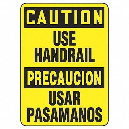 Accuform SBMSTF660VP Sign, Caution USE HANDRAIL/PRECAUCION USAR PASAMANOS", 14" Length x 10" Width x 0.055" Thickness, Plastic, 14" x 10", Black on Yellow
