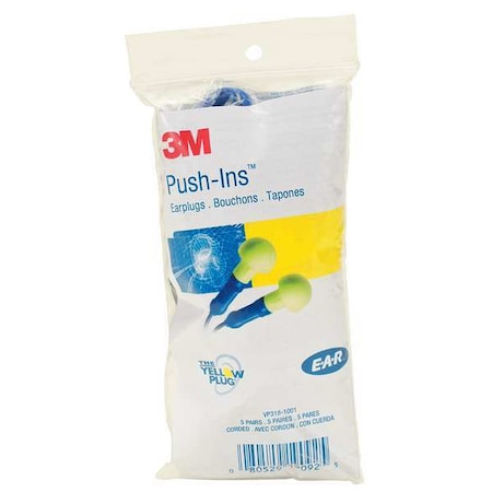 | Feature | <b>Price For:</b> Each <b>Corded/Without Cord</b>: Corded <b>Item</b>: Ear Plugs <b>Cord Material</b>: Vinyl <b>Disposable/Reusable</b>: Disposable <b>Shape</b>: Pod <b>Series</b>: E-A-R(TM) Push-Ins(TM) <b>Plug Color</b>: Yellow <b>Packaging</b>: Vending Pack <b>Ear Plug Size</b>: Universal <b>Metal Detectable</b>: No <b>Pairs Per Package</b>: 5 <b>Noise Reduction Rating (NRR)</b>: 28dB <b>Plug Material</b>: Polyurethane Foam <b>Cord Color</b>: Blue |