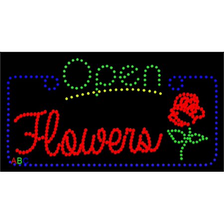 <b>17"x31" ABC LED Signs Flowers Open LED Sign w/Flashing Controller - Standard Outdoor/Indoor</b>: <ul> <li>Customizable</li> <li>12 month limited warranty on parts and labor</li> <li>Uses attractive quality translucent black backing, not ABS plastic</li> <li>Very light weight</li> <li>Highly efficient. Uses up 90% less energy than glass neon</li> <li>Flashing & Animated LED Display</li> <li>Excellent visibility. (including when in direct sunlight)</li> <li>Includes hanging chain</li> <li>Included a 110V AC Adapter</li> <li>Animation/Flashing turned on/off is very simple, via a switch</li> </ul>