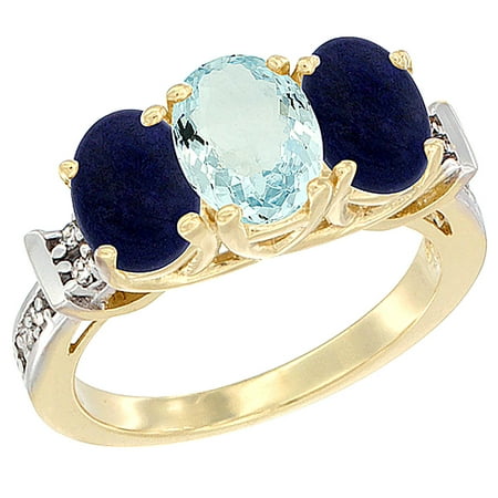 14K Yellow Gold Natural Aquamarine & Lapis Sides Ring 3-Stone Oval Diamond Accent, sizes 5 - 10