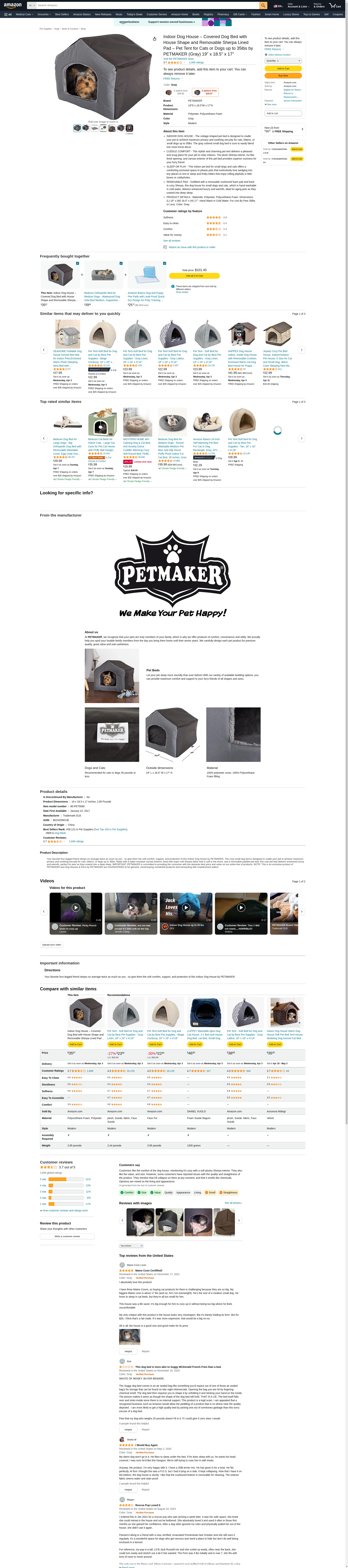 - PRODUCT DETAILS – Materials: Polyester and Polyurethane Foam. Dimensions: (L) 19” x (W) 18.5” x (H) 17”. PETMAKER Dog Houses for Small Dogs should be hand washed in cold water and used by pets 35lbs or less. Color: Gray.