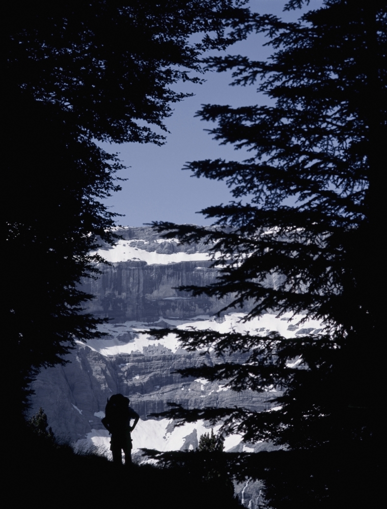 Posterazzi DPI1880877LARGE Walker Climbing Up Hill Between Trees with The Cirque De Gavarnie Poster Print, 24 x 30 -