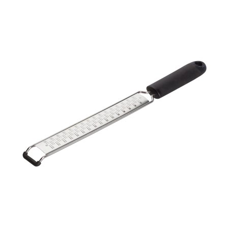 Flavor your favorite dishes by adding freshly-grated ingredients with this handheld grater. It features a corrosion- resistant etched 18/10 stainless steel blade with a ribbon pattern that grates ribbon-shaped pieces of cheese to top off pastas, pizza, and salads. The grater's black, soft-grip handle provides a safe and comfortable grip and the anti-slip feet allow you to conveniently set the grater down on the countertop during use. Included with this item is a blade cover that offers safety when not in use and for added convenience, this tool is dishwasher safe.