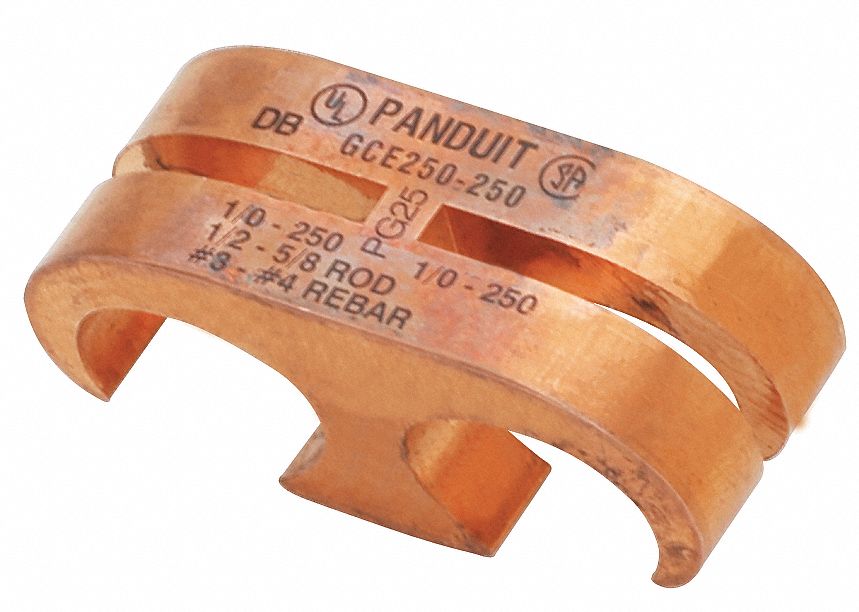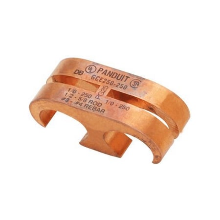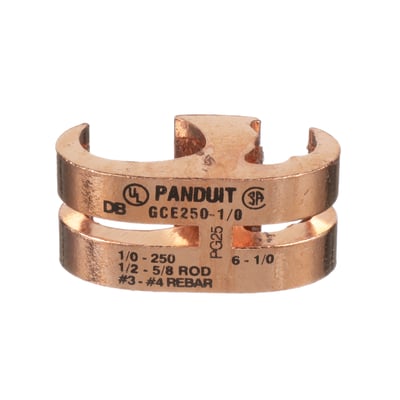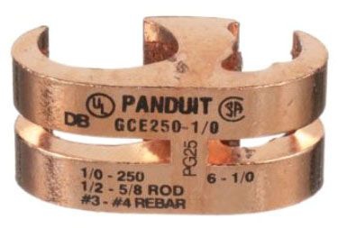 The PANDUIT ground rod connector is an E-style grounding connector. Flexible—use for conductor to conductor, conductor to rebar, and conductor to ground rod applications. Slotted design allows quick-and-easy assembly of conductor to connector using PANDUIT cable ties (included). Designed for the enhanced crimp process.<br /><br /> Item - Grounding Connector: Wire to Wire Grounding Connector<br /> Type - Grounding Connector: Compression<br /> Grounding Wires Connected To: 1/2" to 5/8" Rod, #3 to #4 Rebar<br /> Number of Wires - Grounding: 2<br /> Wire Size - Grounding: 1/0 AWG Stranded to 250 kcmil (Run), 6 AWG Solid to 1/0 AWG Stranded (Tap)<br /> Material - Grounding Connector: Copper<br /> Description/Special Features: E-Style Connector<br /> Standards: UL 467 LISTED, CSA 22.2 CERTIFIED , IEEE 837-2002