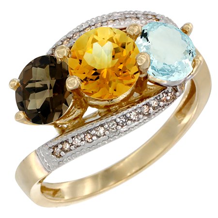 10K Yellow Gold Natural Smoky Topaz, Citrine & Aquamarine 3 stone Ring Round 6mm Diamond Accent, sizes 5 - 10