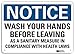 Notice Sign, Vertical Rectangle, Number of Printed Sides 1, English, Sign Format Traditional OSHA, Sign Legend Wash Your Hands Before Leaving As A Sanitary Measure In Compliance With Health Laws, Sign Legend Background Color White, Sign Legend Style Text