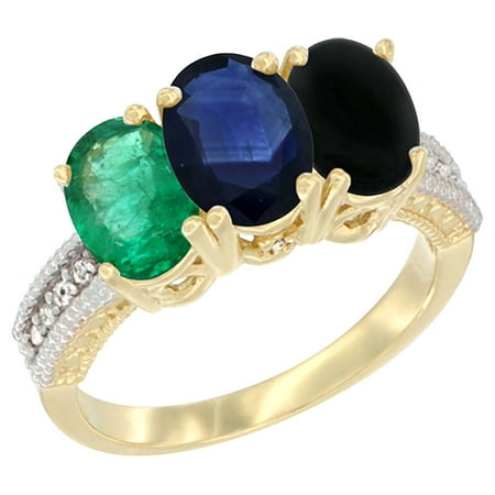 14K Yellow Gold Natural Emerald, Blue Sapphire & Tiger Eye Ring 3-Stone 7x5 mm Oval Diamond Accent, sizes 5 - 10