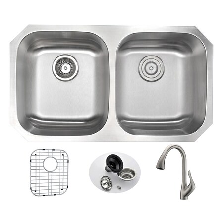Anzzi MOORE Undermount 32 in. Double Bowl Kitchen Sink with Accent Faucet in Brushed Nickel KAZ3218-031B