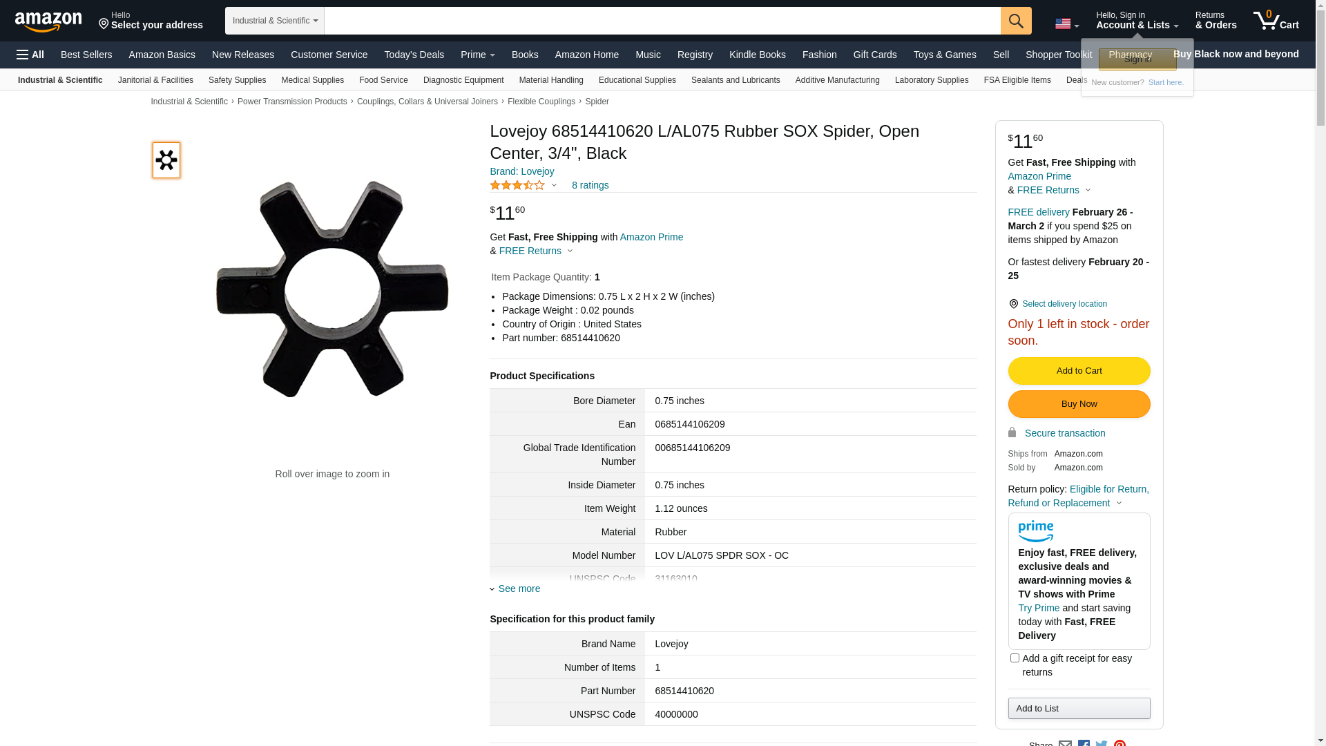 Lovejoy 68514410620 L/AL075 Rubber SOX Spider, Open Center, 3/4", Black