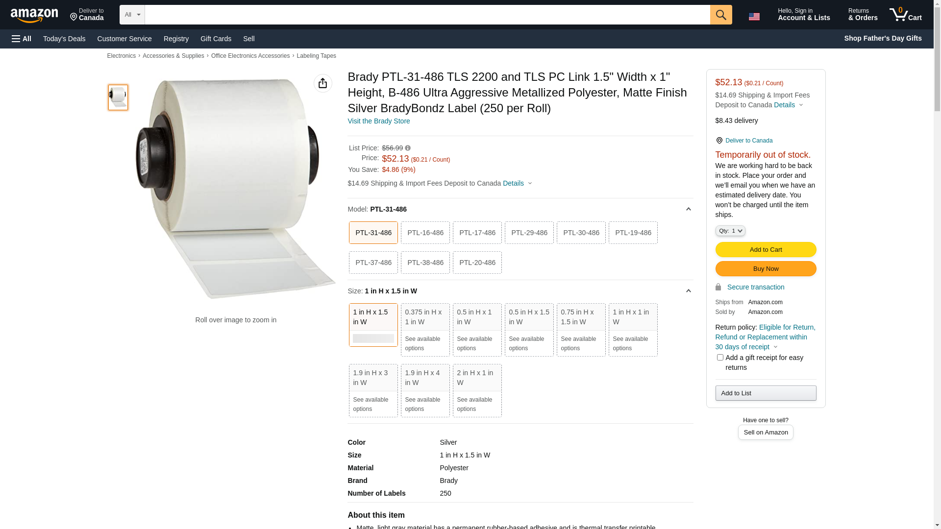 Brady PTL-31-486 TLS 2200 and TLS PC Link 1.5" Width x 1" Height, B-486 Ultra Aggressive Metallized Polyester, Matte Finish Silver BradyBondz Label (250 per Roll)