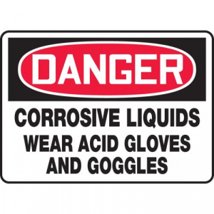 7" x 10" Plastic OSHA Sign: "Corrosive Liquids Wear Acid..." OSHA Sign: "Corrosive Liquids Wear Acid Gloves and Goggles" Plastic (VP) Plastic combines standard, reliable performance with 92% recycled content to create a dependable, Earth-friendly material solution. Semi-flexible, impact-resistant plastic signs are ideal for standard-duty use - for installation indoors and for protected, short-term outdoor applications. Get the look, feel and characteristics of non-recycled plastic signs in an environmentally friendly version.