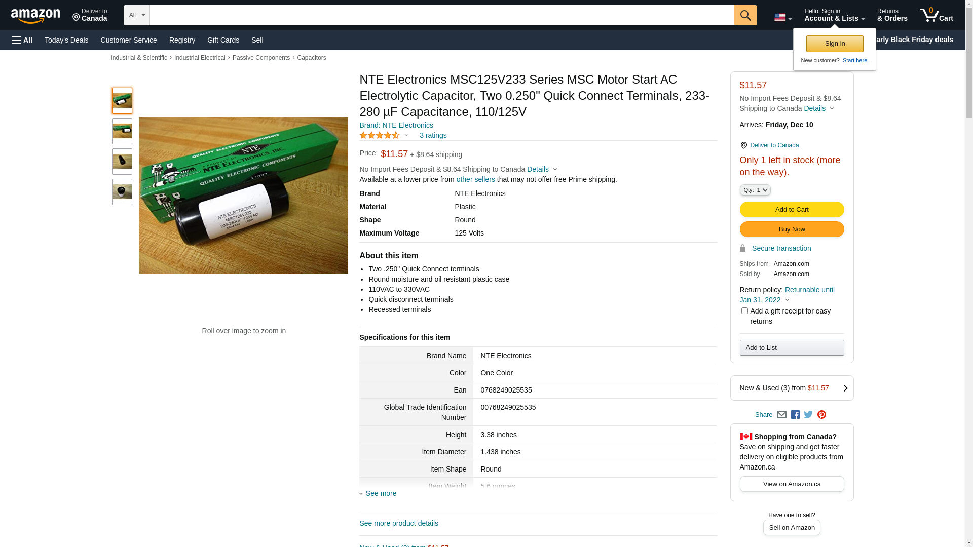 Nte Electronics Capacitor Mot Start 233Mfd 125V - MSC125V233