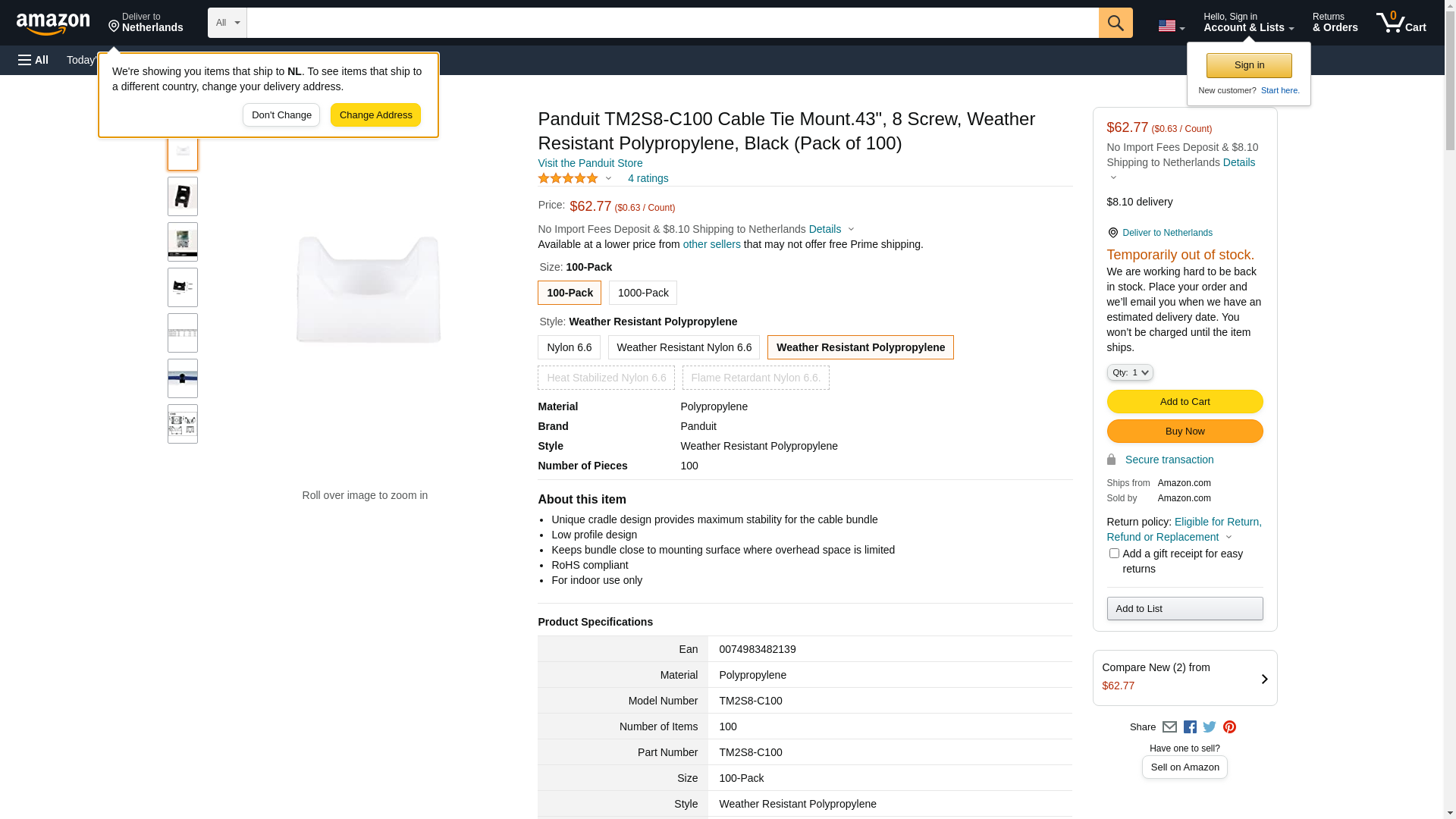 Panduit TM2S8-C100 Cable Tie Mount, 43", 8 Screw, Weather Resistant Polypropylene, Black (Pack of 100)