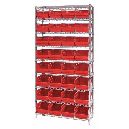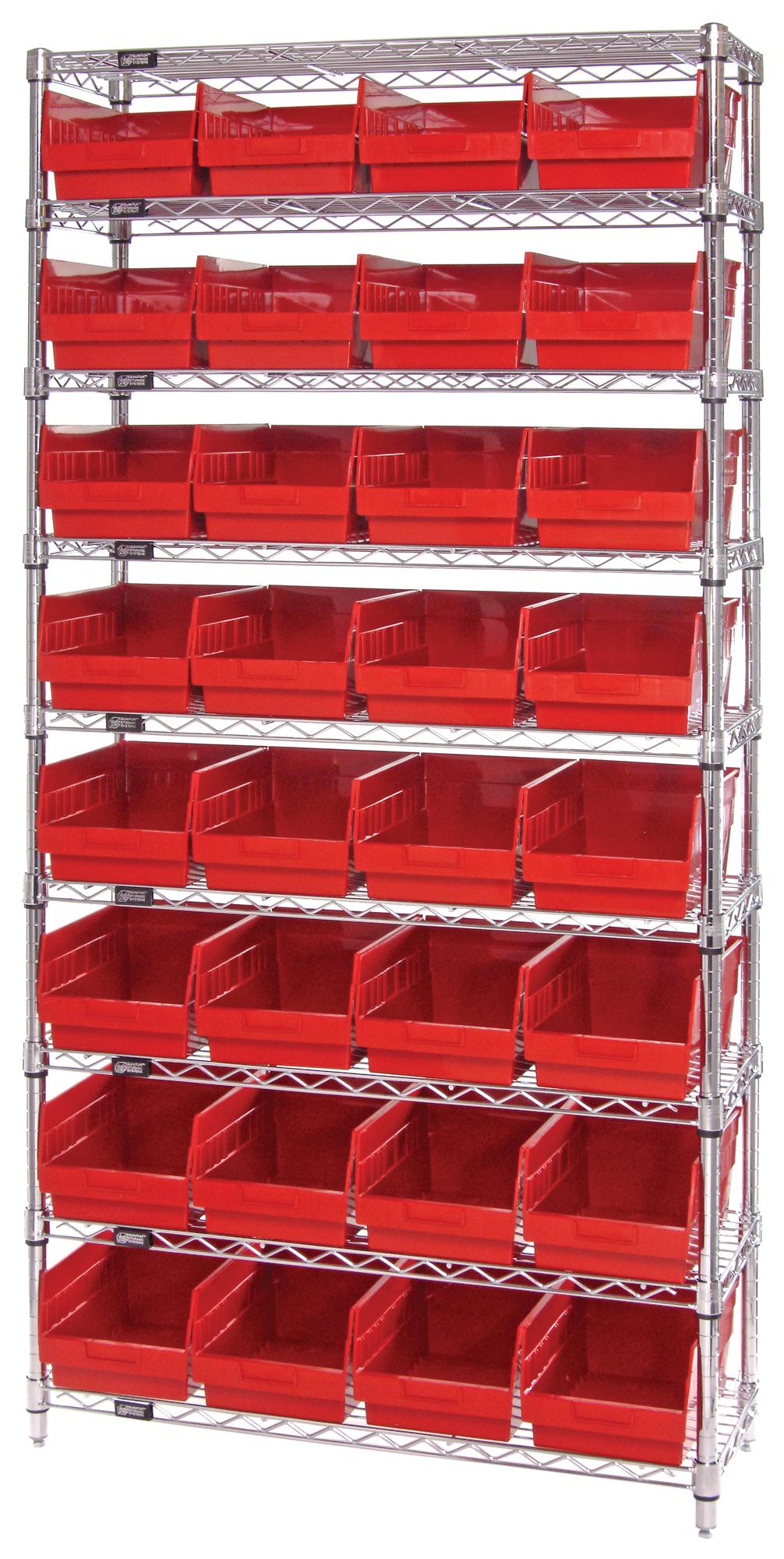 Quantum Storage Systems WR9-208RD 9-Tier Complete Wire Shelving System with 32 QSB208 Red Store-More Bins, Chrome Finish, 74" Height x 36" Width x 18" Depth