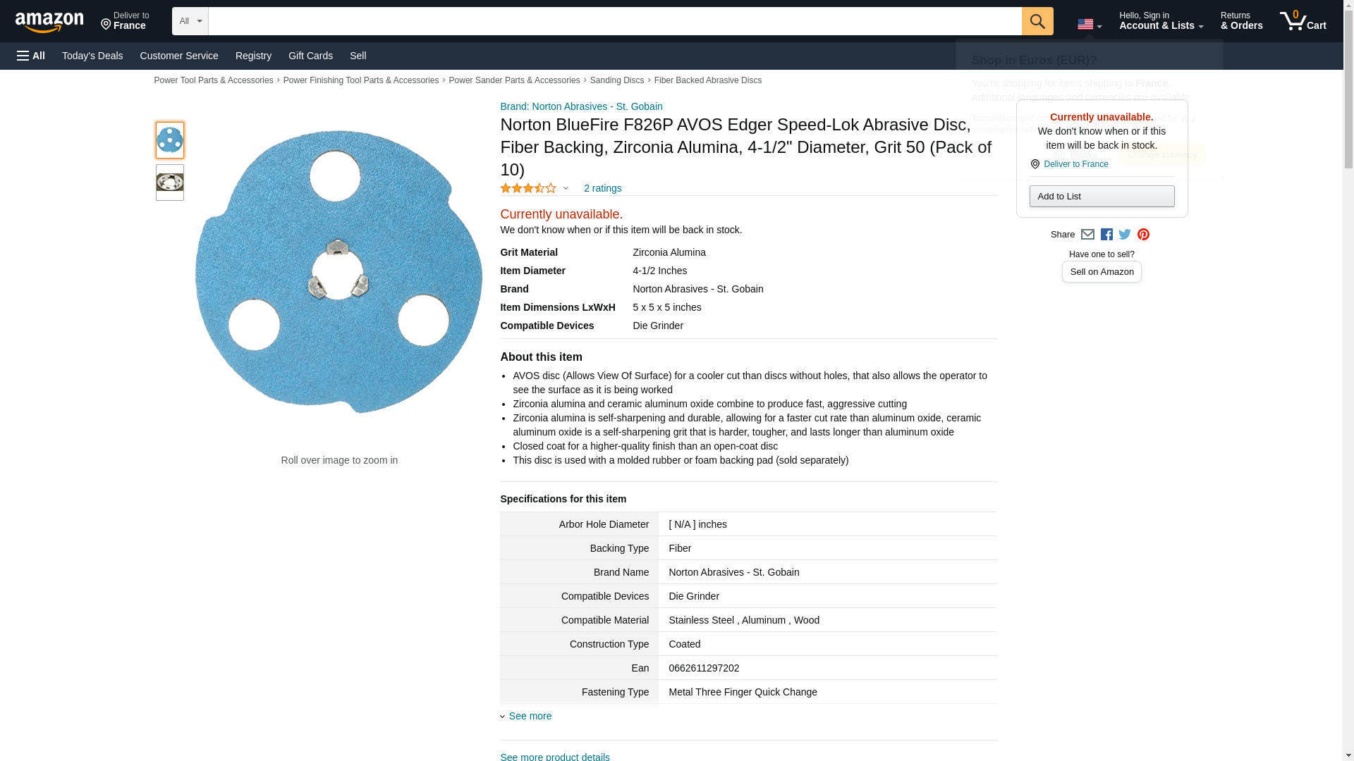| Feature | Price For: Each Item: Quick Change Disc Max. RPM: 12, 000 Grit: 50 Series: F826 Color: Blue Attaching System: Turn-On/Off Grade: Coarse Backing Material: Fiber Abrasive Type: Coated Abrasive Material: Zirconia Alumina Backing Weight: X Disc Dia.: 4-1/2" Attachment Type: Turn-On/Off Country of Origin (subject to change): United States |
