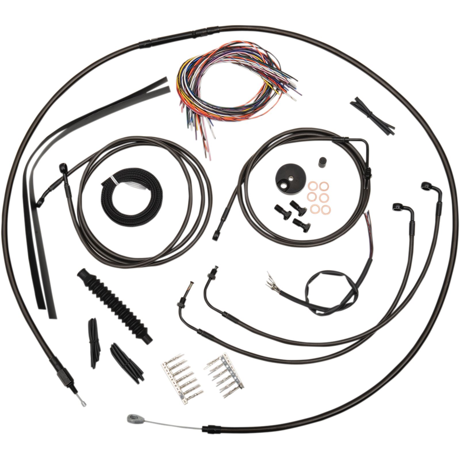 Takes cable calculation headaches out of swapping handlebars.<br> Kits give you the correct length cables, brake lines and wire extensions you need so you can complete a handlebar swap.<br> Stainless braided kits include throttle cable, idle cable (except 08-15 Dressers), clutch cable, brake lines, chrome T brake line junction, banjo bolts, fittings and copper crush washers.<br> Black vinyl/ stainless kits include black vinyl throttle and idle cables (except 08-15 Dressers), black vinyl clutch cable and black stainless brake lines with chrome.<br> fittings, banjo bolts and crush washers.<br> Midnight series kits include stainless steel brakes, cables and lines covered in a black smoke tinted coating with pure black fittings throughout; lines appear graphite or carbon fiber in appearance providing that ultra custom look and the black fittings seamlessly blend with blacked out controls and covers on your bike.<br> Made in the U.S.A..<br> For use with 15in.-17in. ape hangers