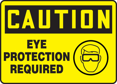 - Price For: Each Legend: Eye Protection Required ANSI Compliant: Yes Double-Sided: No Width: 10" OSHA Compliant: Yes Material: Plastic Sign Legend Color: Black Glow-in-the-Dark: No Item: Caution Sign Printed Language: English UV Resistant: Yes Height: 7" Sign Background Color: Yellow Sign Material: Plastic Sign Subject Matter: Personal Protection