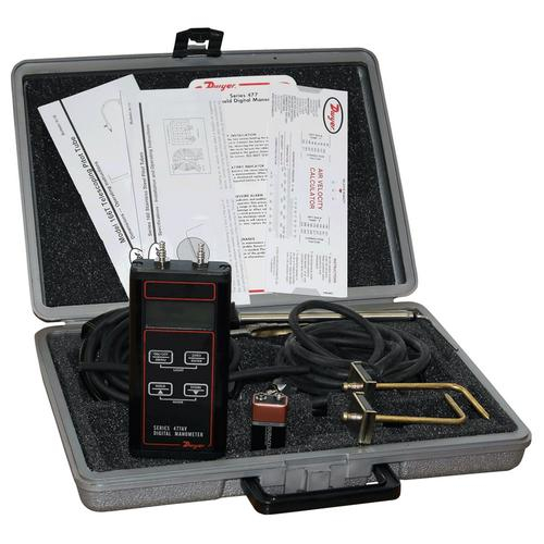 The Dwyer 477-1T-AV Air Velocity Manometer Kit is a small, light and easy to use kit. No set-up or leveling needed. The digital manometer reads from 0 - 20" w.c. with ± 0.5% F.S. accuracy. The manomter included with the 4771TAV stores up to 40 readings in memory for later reference, with selectable English/Metric pressure, flow and velocity units that are visible on a large, backlit 0.4" LCD readout. Both audible and visual overpressure alarms and a “low battery” warning are standard features.|Each kit includes convenient telescoping Pitot tube, Model 166T which is fully adjustable from 11.5 to 36 inches (29.2 to 91.4 cm). In addition, two static pressure tips with magnetic mountings measure pressure drop across filters, condenser coils, etc. Kit comes complete with rubber tubing, 9V battery, step drill, AV calculator slide rule, and custom fitted carrying case. An indispensable test kit for the plant engineer, industrial hygienist and HVAC technician.