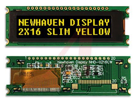 Newhaven 2x16 Yellow Slim Character OLED Display with Display Format 2x16 with 5.57 x 2.97 Character size Using 4/8-bit Parallel, SPI, I2C Interface Full Part Number: NHD-0216CW-AY3