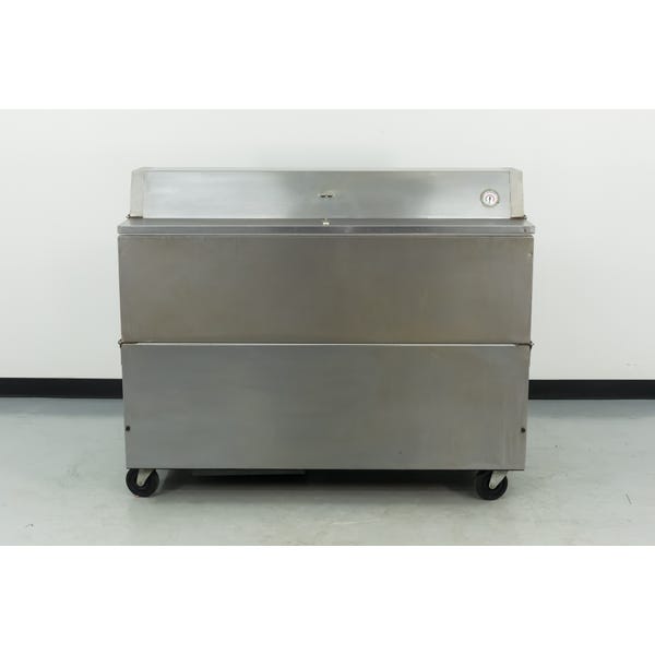This Used Beverage Air STF58-1-S Milk Cooler has a stainless steel exterior and interior, making cleanup and maintenance a breeze, dial thermometer that ensures correct cabinet temperature at all times, and the dual flip top feature allows customers to gr
