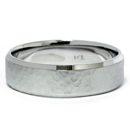 - 14k White Gold : This masculine 14k white gold band has a brushed hammered finish and brightly polished beveled edges. 14k