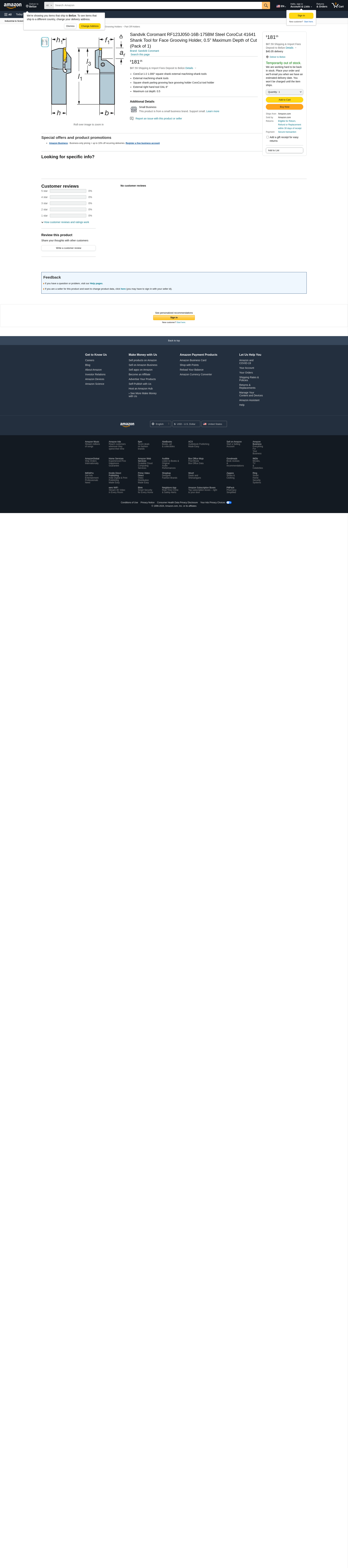Sandvik Coromant RF123J050-16B-175BM Steel CoroCut 41641 Shank Tool for Face Grooving Holder, 0.5" Maximum Depth of Cut (Pack of 1)