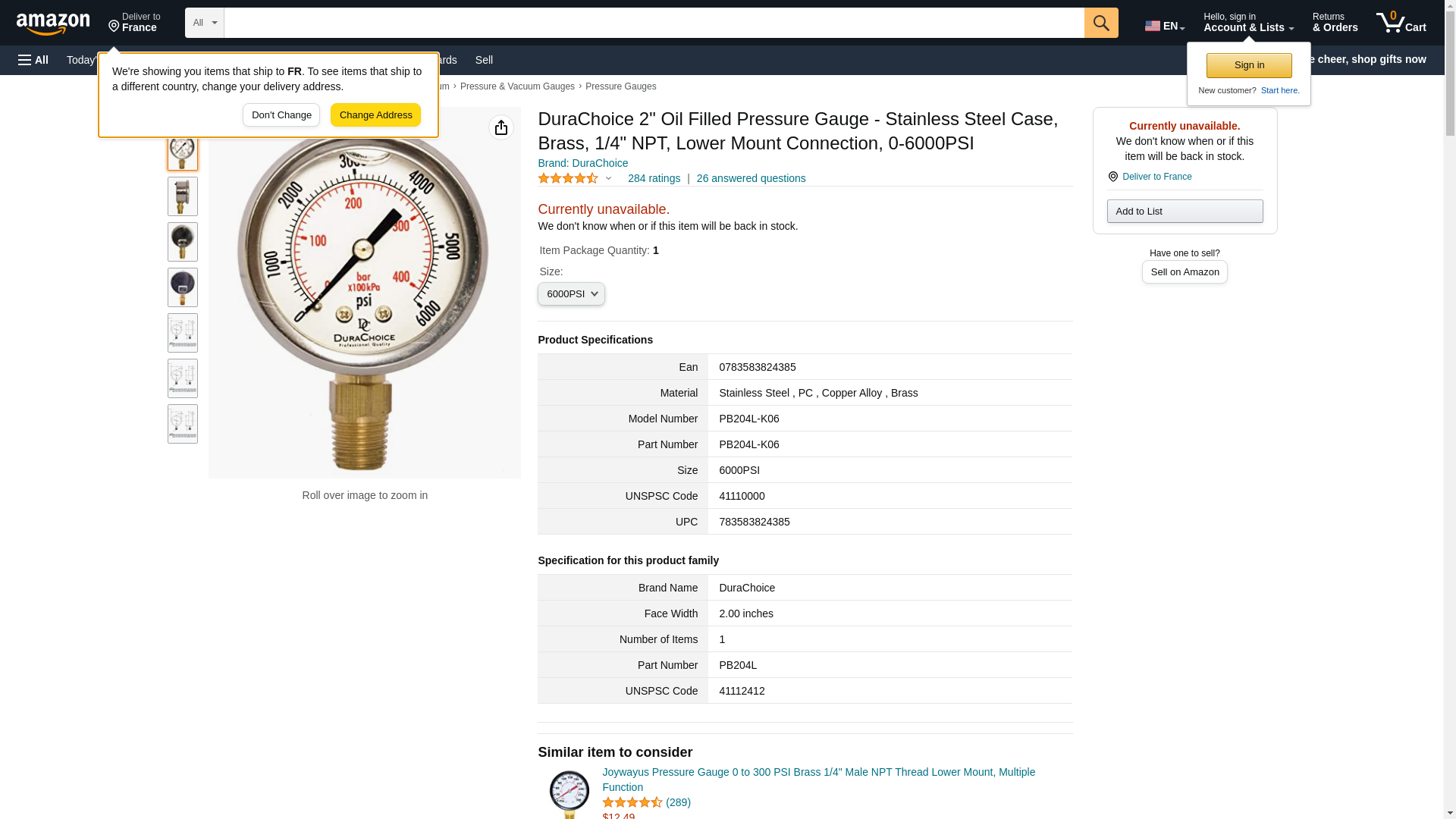 DuraChoice PB204L-K06 oil filled pressure gauge. 2" dial size. 1/4" NPT lower mount fitting. Stainless steel case with brass fittings. Measures 0-6000 PSI.