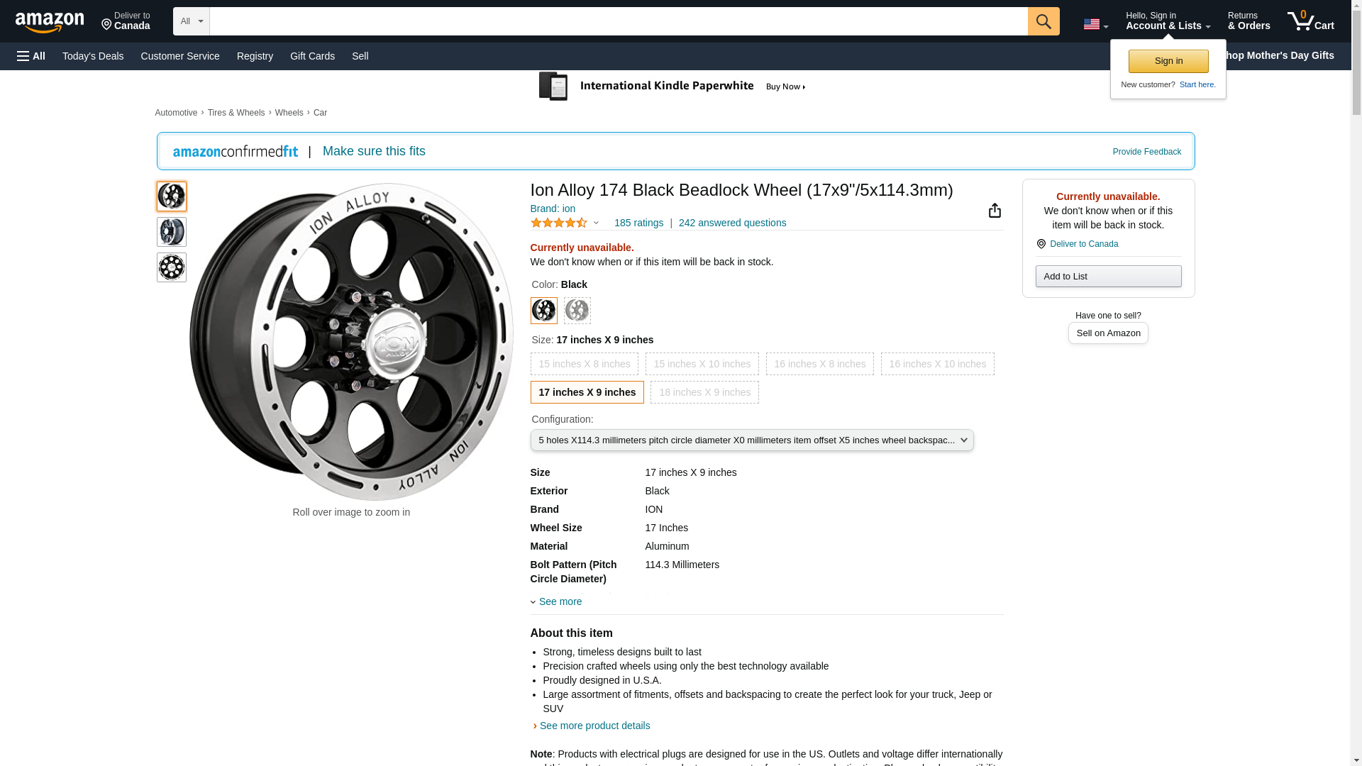 ION 174 Alloy Wheel/Rim Black MACHINED Lip Size 17x9 INCH Bolt Pattern 5X114.3 Offset 0 Center BORE 83.82 (Priced Individually) Center CAPS Included, Lug Nuts NOT Included