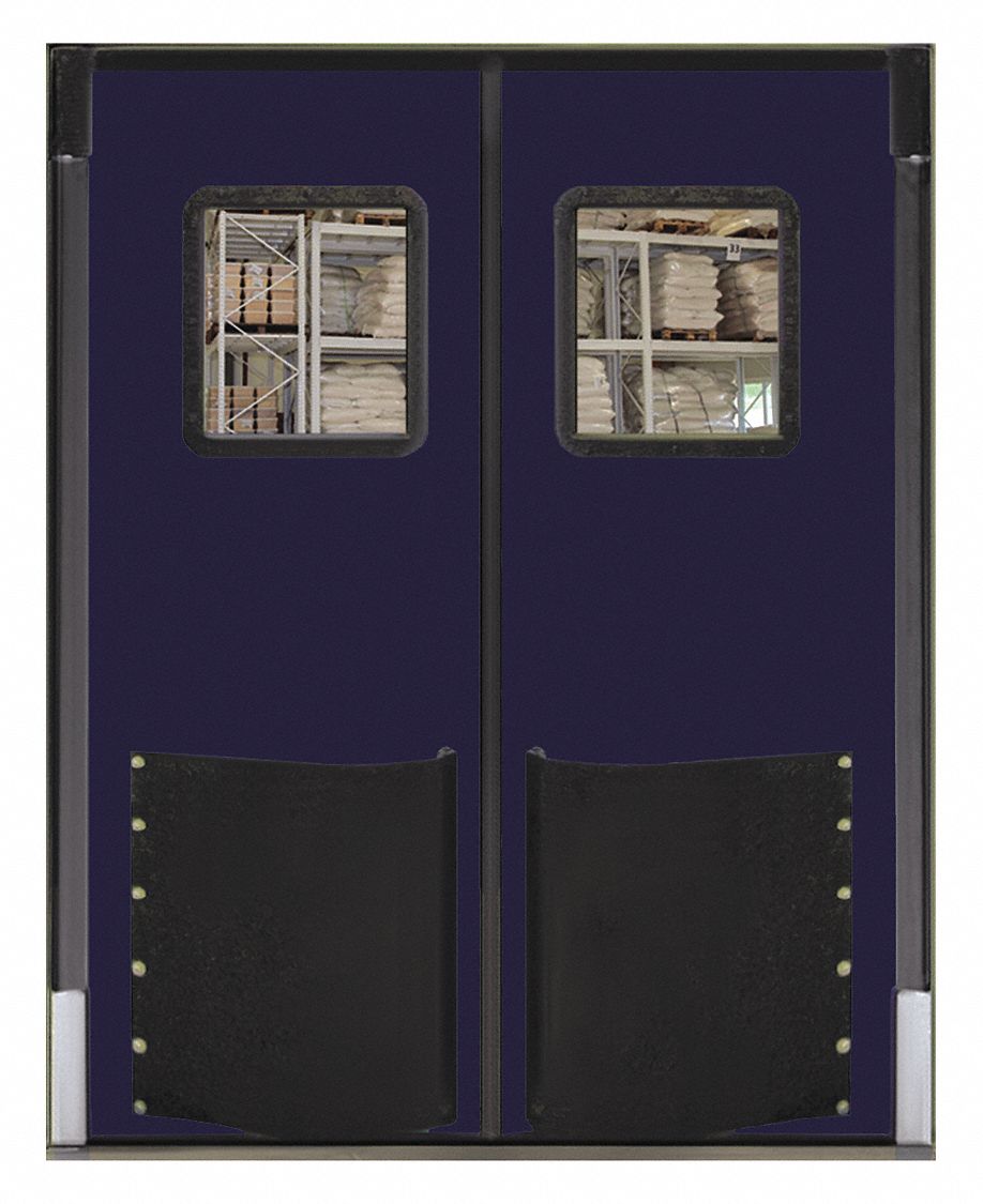 Swinging Door, Door Height 8 ft., Door Width 7 ft., Door Color Navy Blue, Swinging Door Material Polyethylene, Textured (Polyethylene Eggshell) Finish, Door Thickness 3-3/4 In., Number of Doors 2, Window Height 16 In., Window Width 16 In., Bumpers Included Yes, Door Seals Included Yes, Opening Height 8 ft., Opening Width 7 ft., Window Color Clear, Window Material Polycarbonate, Left and Right Jamb, Insulation Value 25, Standards NSF, USDA and EISA Door Seals Included : Yes Swinging Door Material : Polyethylene Finish : Textured (Polyethylene Eggshell) Opening Height : 8 ft Window Width : 16 in Window Included : Yes Includes : 24 in Spring Bumpers, Mounting Hardware Swinging Door Core Material : Non-CFC Urethane Core Item : Swinging Door Bumpers Included : Yes Window Color : Clear Door Thickness : 3 3/4 in Window Material : Polycarbonate Door Width : 7 ft Opening Width : 7 ft Standards : NSF, USDA and EISA Insulation Value : 25 Hinges : Left and Right Jamb Door Height : 8 ft Door Material : One Piece Molded Polyethylene Window Height : 16 in Number of Doors : 2 Door Color : Navy Blue Country of Origin (subject to change) : United States