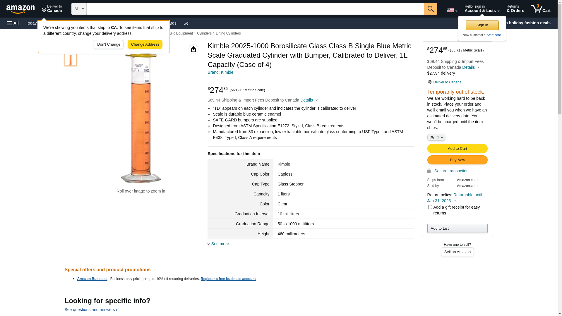 Kimble 20025-1000 Glass Class B Single Blue Metric Scale Graduated Cylinder with Bumper, 1L Capacity, 50 - 1000mL Gra...