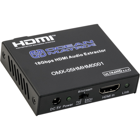 Separate the audio from your HDMI path with the Ocean Matrix <b>OMX-05HMHM0001</b>. This handy device is the ideal addition to conference rooms, stadium venues and auditoriums where the video path needs to be sent to the projection system while the audio path gets routed to the front of house PA system.</p><p>The OMX-05HMHM0001 audio extractor breaks out the HDMI audio signal to left and right analog audio channels via 3.5mm TRS jack, optical via Toslink, and HDMI audio for surround sound and similar receivers. It also features an HDMI looping output. The video 10-bit HDR pass through and the smart EDID management features preserve the original video supporting resolutions up to 4K2K@50/60Hz. The ARC (audio return channel) function allows audio to be sent back from the receiver to the transmitter, eliminating the need for extra audio cables.</p>