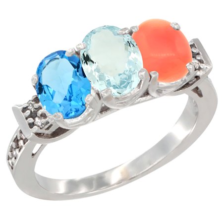 14K White Gold Natural Swiss Blue Topaz, Aquamarine & Coral Ring 3-Stone 7x5 mm Oval Diamond Accent, sizes 5 - 10
