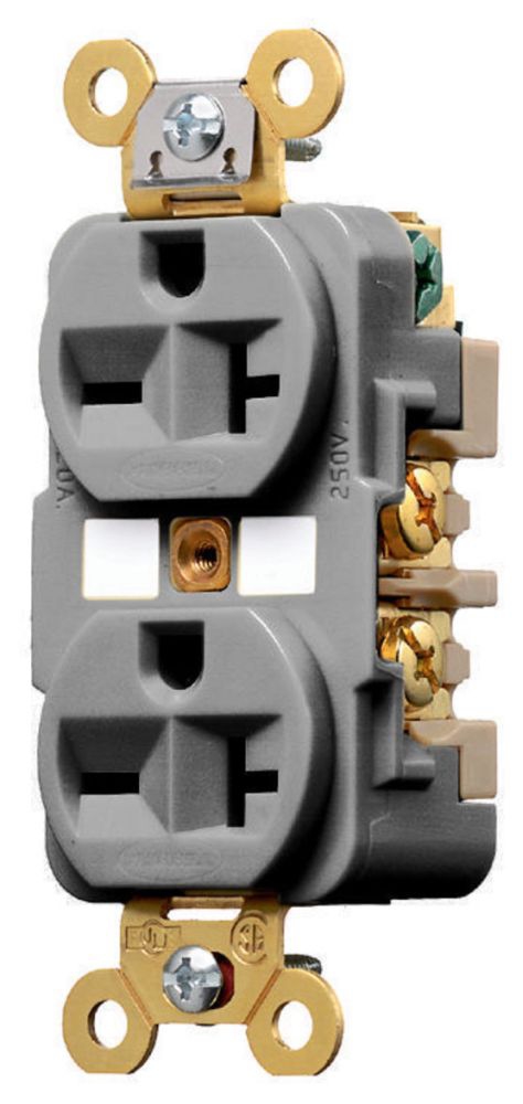 Straight-Blade 2-Pole, 3-Wire ReceptaclesHBL Extra Heavy-Duty Industrial Series Superior impact resistance Circuit identification Reduced heat buildup Low resistance to ground path<br /><br /> Item: Receptacle<br /> Type - Plugs and Receptacles: Straight Blade<br /> Application Environment: Heavy Use Industrial/Harsh Environments<br /> Amps - Plugs and Receptacles: 20<br /> NEMA Receptacle Configuration - Plugs and Receptacles: 6-20R<br /> Voltage - Plugs and Receptacles: 250VAC<br /> Number of Poles: 2<br /> Number of Wires: 3<br /> Tamper Resistant: No<br /> Weather Resistant - Plugs and Receptacles: No<br /> Outlet Type - Plugs and Receptacles: Standard Duplex<br /> Mounting Type - Plugs and Receptacles: Flush<br /> Color - Plugs and Receptacles: Gray<br /> Item - Plugs and Receptacles: Receptacle<br /> Wiring Method - Plugs and Receptacles: Back and Side<br /> Surge Suppression: No<br /> Material: Nylon/Reinforced PET<br /> Phase: 1<br /> HP: 2.0<br /> Power Indicator: No<br /> Corrosion Resistant: No<br /> Number of Gangs: 1<br /> Description: Finder Groove, Grounding<br />