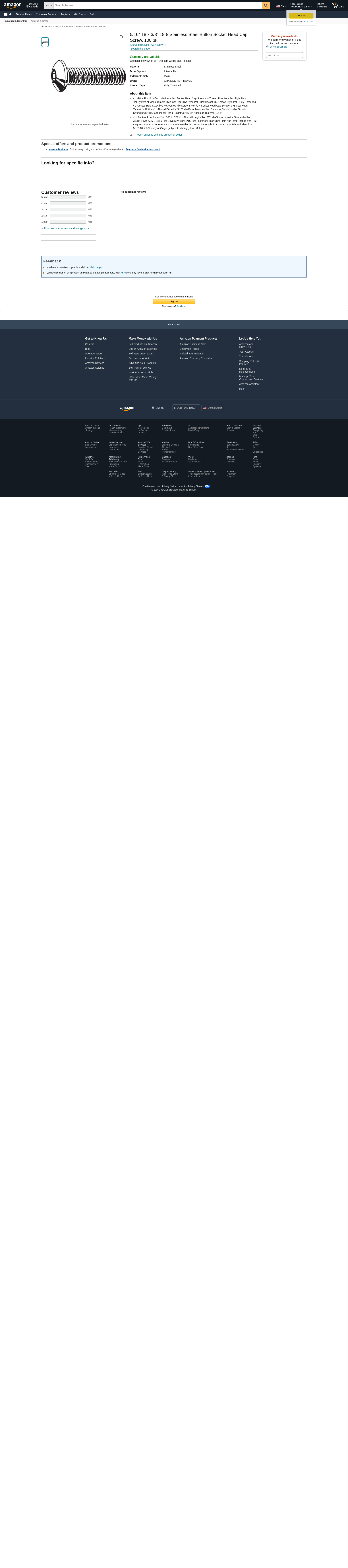 Value Brand, U51030.031.0037, SHCS, Button, 5/16-18x3/8, 18-8 SS, PK100