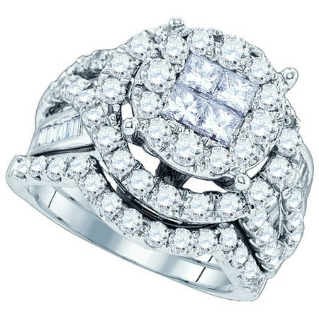 <p><span style="font-size:16px;"><b><u>Description</u></b><br /></span></p> <p><span style="font-size: 14px;">14kt White Gold Womens Princess Round Diamond Soleil Bridal Wedding Engagement Ring Band Set 3.00 Cttw</span></p> <br /> <p><span style="font-size:16px"><u><b>Gemstone Details</b></u></span></p> <p><span style="font-size:14px">3.00 Carats total weight<br /><br />All diamonds are natural and conflict-free in origin<br /><br /></span></p> <ul type="square"> <b>Princess Diamond</b> <br /> <li>1/2 ct.t.w.</li> <li>I1-I2 clarity</li> <li>H-I color</li> <li>Invisible setting</li> </ul> <br /> <ul> <b>Round Diamond</b> <br /> <li>2 & 1/2 ct.t.w.</li> <li>I1-I2 clarity</li> <li>H-I color</li> <li>Prong setting</li> </ul> <br /> <p><span style="font-size:16px"><u><b>Specifications</b></u><br /></span></p> <p><span style="font-size:14px">14kt White Gold<br />12.82 grams (approximately)<br />Ring size selectable</span></p> <p><span style="font-size:11px">Combined diamond weight of 3.00 carats total weight represents a range of 2.95 - 3.05 cts. t.w.</span></p>