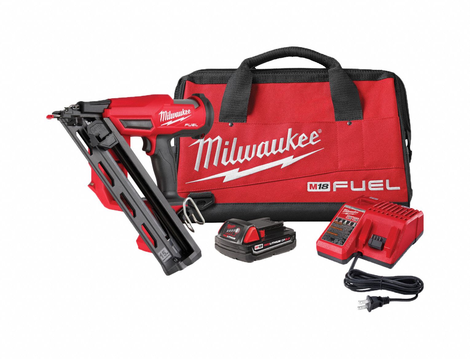The MILWAUKEE M18 FUEL 15 Gauge Finish Nailer Kit provides peak productivity on the jobsite, delivering unmatched nailing performance without the hassle of a compressor and hose. Leveraging a nitrogen air spring mechanism, the 15 Gauge Finish Nailer consistently sinks nails to the required depth in hard and softwoods while leaving clean nail holes, making for repeatable results and easy filling. The nitrogen air spring mechanism, combined with Milwaukee POWERSTATE Brushless Motor and REDLINK PLUS Intelligence, delivers a pneumatic-like nailing response with zero ramp-up time from nail to nail for productive and efficient jobs. This Milwaukee cordless finish nailer features a compact and ergonomic design providing access into tight spaces where nailing is required while limiting fatigue when using the tool. When paired with an M18 REDLITHIUM CP2.0 battery pack, this finish nail gun fires up to 750 nails per charge and is fully compatible with all M18 REDLITHIUM batteries. The M18 FUEL 15 Gauge Finish Nailer Kit delivers the pneumatic performance that professional carpenters and remodelers demand with finishing nails for trim, crown molding, baseboards, and more with the freedom and convenience of cordless. California Proposition 65 Warning Required No Charger Included Yes Country of Origin China CSA Certified No ETL Listed No Fastener Format Strip globalTradeItemNumber (GTIN) 00045242591930 Height (in) 12.6 Internal Supplier Part # 283921CT Internet Product Code (IPC) 3E5A3BE4F56 Manufacturer Warranty 5 Years (Tool), 2 Years (Battery) Nailer / Stapler Design Nailer Net Tool Weight (lbs) 7.5 Number of Batteries Included 1 Number of Batteries Required 1 Package Contents (1) 15 Gauge Finish Nailer (2839-20), (1) M18 REDLITHIUM CP2.0 Battery, (1) M18 & M12 Charger, Contractor Bag,Case Package Depth 7.79 Package Height 15.0 Package Weight 13.45 UL Listed Yes