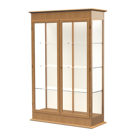 Display Cabinets Varsity Cases features solid oak and oak veneers for a traditional furniture look. Varsity cases have built-in cornice lighting and decorative cove moldings. Case sides and doors have tempered glass for safety. Cases come with door lock and 2 keys and built in levelers. Each case has 3 - full-length adjustable glass shelves and steel brackets. Ships fully assembled.