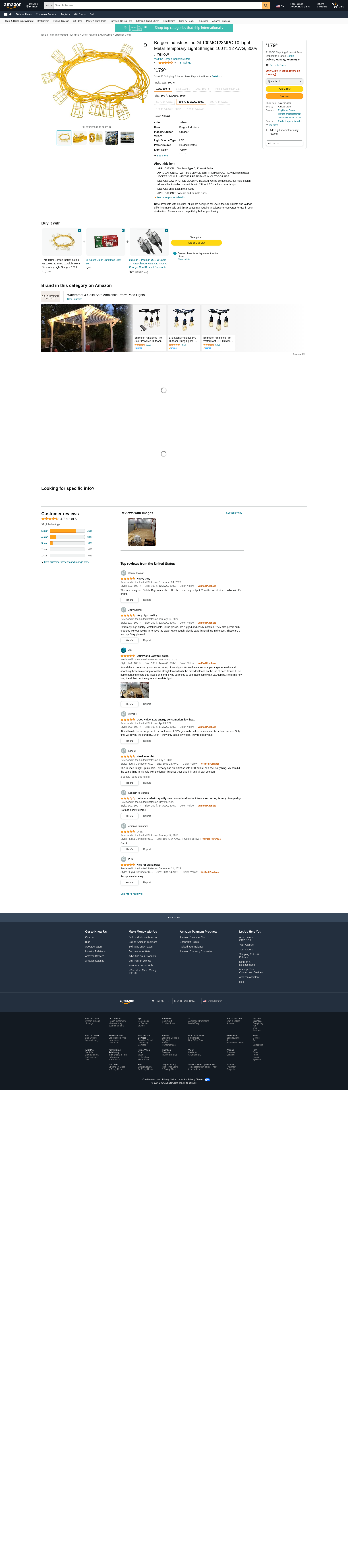Bergen Industries Inc GL100MC123MPC 10-Light Metal Temporary Light Stringer, 100 ft, 12 AWG, 300V , Yellow