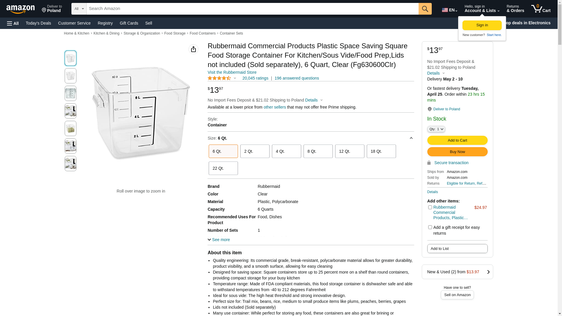 Rubbermaid Commercial Food Storage Container,8 3-4 in L,Clear FG630600CLR ZO-G1720704 - SIM Supply