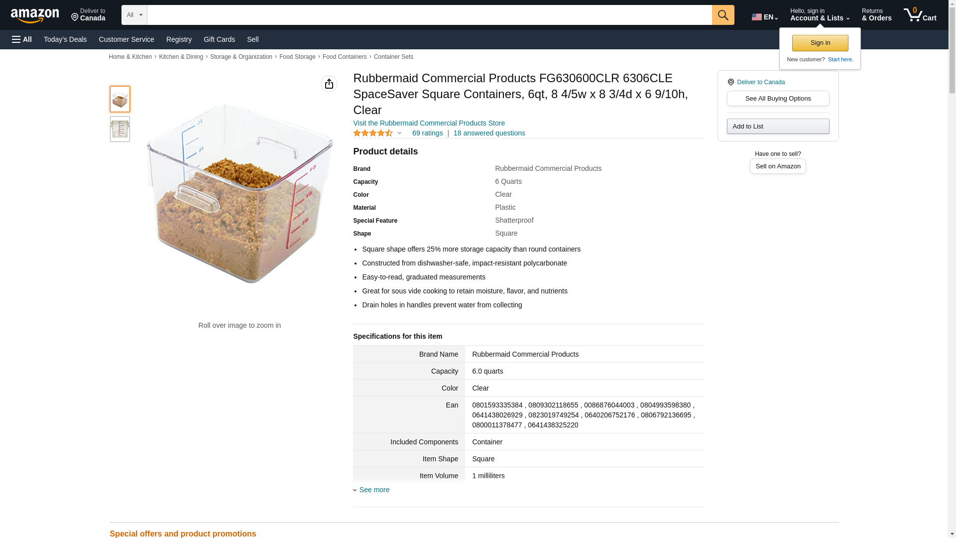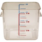 Square containers store up to 25% more on a shelf than round containers. Break-resistant. clear polycarbonate for visibility and long life. Smooth interiors for easy cleaning. dishwasher safe. Precise measurement graduations red for U.S.. blue for metric. Easy-grip. pocket-style handles with drain holes. Stack in use and nest for compact storage. NSF Certified. Temperature range: -40F/-40C to 212F/100C. Lids and containers (sold separately).