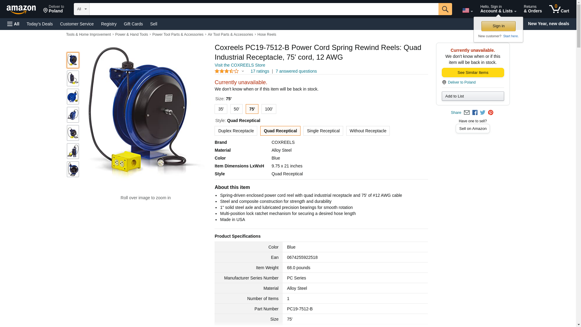 | Feature | "Spring-driven enclosed power cord reel with quad industrial receptacle and 75' of #12 AWG cable" |