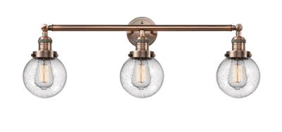 INNOVATIONS LIGHTING 205-AC-G204-6-LED Beacon 3 Light Bath Vanity Light part of the Franklin Restoration Collection. The Beacon 3 Light Bath Vanity Light is part of the Franklin Restoration Collection. Solid Brass 180 Degree Adjustable Swivels with internal teeth that lock in at 5 degree intervals With Engraved Cast Cup. Collection: Franklin Restoration. Material: Steel, Cast Brass, Glass. Metal Finish(Body): Antique Copper. Metal Finish(Canopy/Backplate): Antique Copper. Dimension(in): 30(W) x 12(H) x 7.5(Ext). Bulb: (3)3.5 Watt LED Vintage Medium Base Bulb Included,Dimmable. Color Temperature: 2700. Color Rendering Index(CRI): 82. Lumens): 350. Voltage: 120. Glass: Seedy Beacon/Seeded. Shade Shape: Globe. Shade Material: Glass. Shade Size(in): 6 X 5.75. Shade Fitter Measurement: 3.25 inch Fitter. Canopy Dimension(in): 4.5. Backplate Dimension(in): 4.5x0.75. Solid Brass 180 Degree Adjustable Swivels with internal teeth that lock in at 5 degree intervals With Engraved Cast Cup. Fixture can be hung with bulbs facing up or down. UL/CUL Damp Rated. Warranty: 2 Year Finish, Lifetime Electrical.