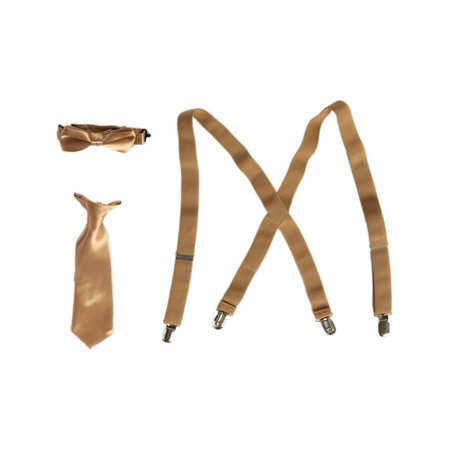 <ul> <li>Three piece combo special occasion set</li> <li>Clip-on neck tie, a bow tie and adjustable length suspenders</li> <li>Quality silk-touch material and classy color khaki</li> <li>Accessories that are so useful to complete a formal look</li> <li>Sizing is based on U.S. clothing size standards</li> </ul>
