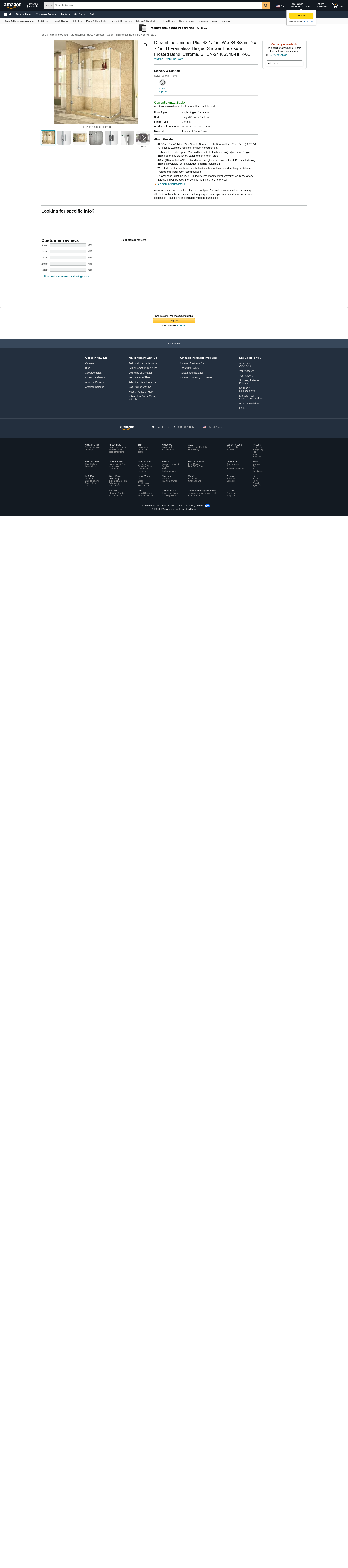 DreamLine SHEN-24485340-HFR Unidoor Plus 48 1/2 x 34 3/8 Inch Hinged Shower Enclosure Half Frosted Glass The Unidoor Plus Shower Enclosure will impress with the classic style of a frameless glass design. Premium 3/8" thick clear tempered glass combined with high quality solid brass hardware deliver the rich look of custom glass at an incredible value. Let the Unidoor Plus shine on your shower space with a streamlined design and elegant touches. Product Specifications: 3/8 in. (10mm) thick clear tempered glass Chrome, Brushed Nickel or Oil Rubbed Bronze finish hardware Frameless glass design Half Frosted Glass 1/2 in. Out-of-plumb adjustment on stationary panel side Solid brass wall mount self-closing hinges (5 degree offset) Anodized aluminum U-channel profile for stationary panel(s) installation Reversible for right or left door opening installation Materials: Tempered Glass, Brass Tempered glass ANSI certified Optional SlimLine shower base for select sizes Limited 5 (five) year manufacturer warranty Available Finish: Chrome: SHEN-24485340-HFR-01 Brushed Nickel: SHEN-24485340-HFR-04 Oil Rubbed Bronze: SHEN-24485340-HFR-06 SKU: SHEN-24485340-HFR-01 SHEN24485340HFR01 SHEN-24485340-HFR-04 SHEN24485340HFR04 SHEN-24485340-HFR-06 SHEN24485340HFR06